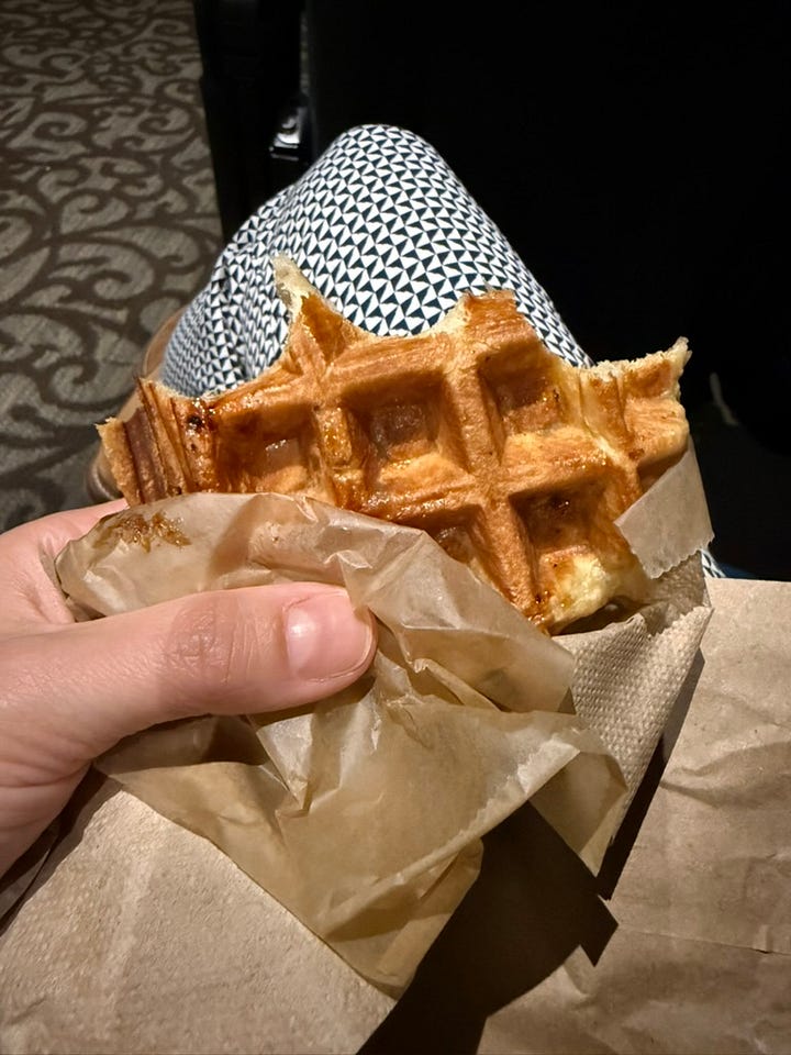 Sneaking a hot, delicious, sugary Belgian waffle into a movie theater