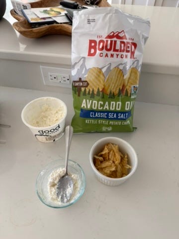 Snacking on potato chips and cottage cheese. This was a snack my mom always loved eating and I find addictive. I know it sounds a little weird, but don’t yuck my yum until you’ve tried it.